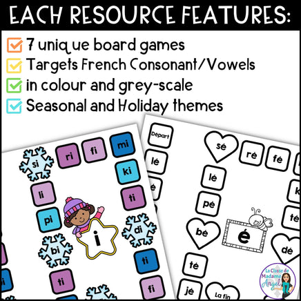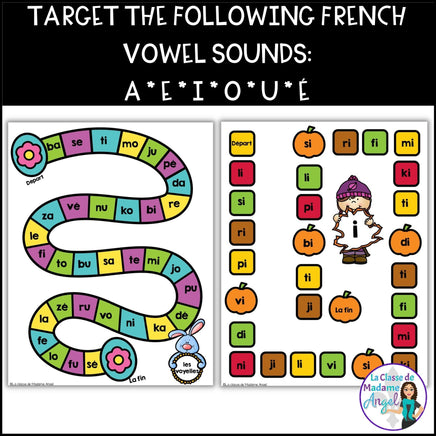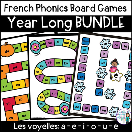 This Bundle of French Phonics board games is perfect for working on "la conscience phonologique". Each resource features 7 board games and has students practice blending consonants with the vowel sounds: a - e - i - o - u - é.